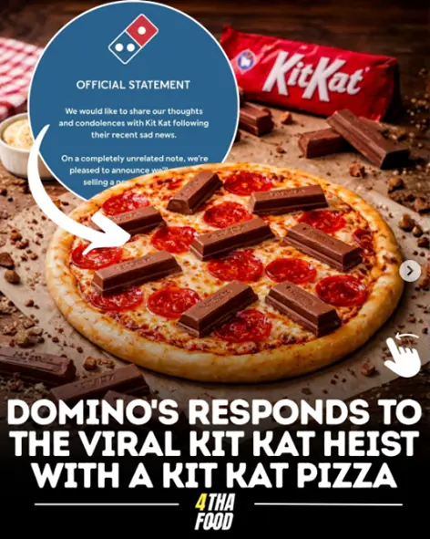 - Domino’s UK ha “annunciato” una pizza al KitKat senza produrla: la notizia ha circolato sui media come se fosse reale.